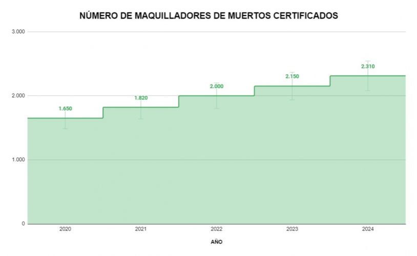En los últimos años, el sector de la estética funeraria ha mostrado un notable crecimiento en España, evidenciado por el aumento en el número de maquilladores de difuntos certificados. En 2020, el registro de profesionales con esta especialización era de 1.650. Este número ha ido en aumento cada año, con un incremento a 1.820 en 2021 y alcanzando los 2.000 en 2022. La tendencia ascendente continuó en 2023, con 2.150 profesionales certificados, y se estima que en 2024 se superará la cifra de 2.300.