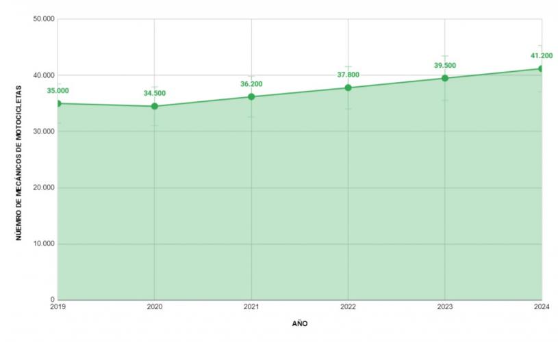 Entre 2019 y 2024, el número de mecánicos de motocicletas en España ha experimentado un crecimiento sostenido. En 2019, se estimaba que había alrededor de 35.000 profesionales en este campo. Aunque en 2020 se observó un ligero descenso, con un total de 34.500 mecánicos, esta disminución fue temporal. A partir de 2021, el sector comenzó a recuperarse y a crecer de forma constante. Ese año, el número de mecánicos ascendió a 36.200, y la tendencia positiva continuó en 2022, alcanzando los 37.800.