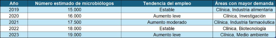 La microbiología es una disciplina en crecimiento, con una demanda constante de profesionales en múltiples sectores. Según datos del Instituto Nacional de Estadística (INE), las ciencias biomédicas, incluidas la microbiología y la biotecnología, están experimentando un crecimiento significativo en España, con una tasa de empleo que ha aumentado en los últimos años gracias al auge de la investigación científica y la biotecnología.