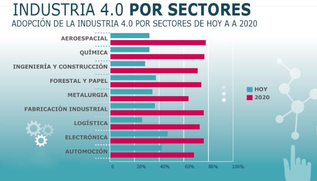 En el siguiente gráfico, vemos una predicción del porcentaje de avances que se implementarán en cuanto a industria 4.0 al final de 2020, dividida por sectores:
