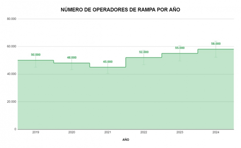Sin embargo, a partir de 2022, se produce una recuperación notable, con un aumento constante en el número de operadores de rampa. En ese año, la cifra ascendió a 52.000, y en 2023 continuó en ascenso hasta llegar a 55.000. La tendencia alcista se mantiene en 2024, con un total de 58.000 operadores, lo que indica una consolidación y crecimiento sostenido en el sector. Este aumento puede reflejar una mejora en la demanda de servicios relacionados con la gestión y operación de rampas, así como una recuperación económica general que favorece la contratación en esta área.