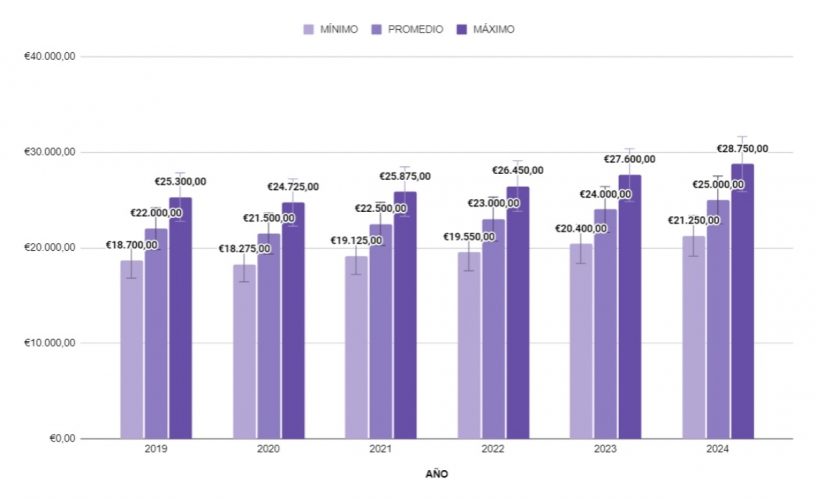 La perspectiva salarial para los operadores de rampa ha experimentado una evolución constante en los últimos años. En 2019, el salario mínimo era de 18.700 euros, el promedio alcanzaba 22.000 euros y el máximo se situaba en 25.300 euros. En 2020, se produjo una ligera reducción en estos valores, con un mínimo de 18.275 euros, un promedio de 21.500 euros y un máximo de 24.725 euros. A partir de 2021, los salarios comenzaron a aumentar: el mínimo subió a 19.125 euros, el promedio a 22.500 euros y el máximo a 25.875 euros.