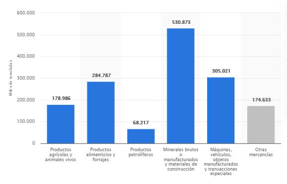 Volviendo a la logística de materiales de construcción, en el siguiente gráfico podemos observar la distribución de la toneladas de mercancías transportadas por carretera en nuestro país en el año 2019, según tipo de mercancía. Podemos observar que los minerales brutos o manufacturados y los materiales de construcción encabezan la estadística con 530.873 toneladas.