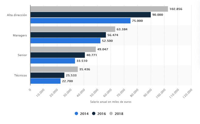 En un periodo de tiempo de cuatro años, entre 2014 y 2018, podemos ver cómo los salarios para diferentes rangos dentro del mundo de la informática aumentaron considerablemente.