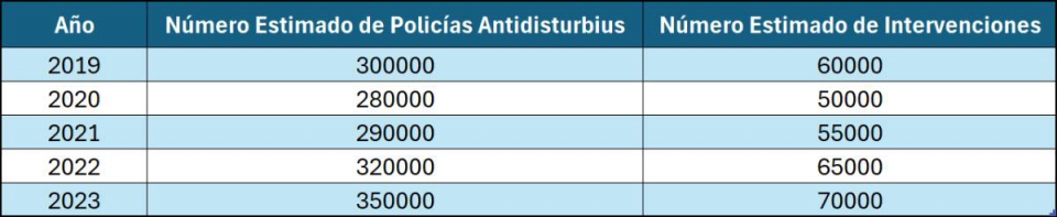 Los últimos años han sido testigos de una notable evolución en las unidades de policía antidisturbios de España. Nuestras estimaciones indican un aumento constante en el número de efectivos, así como en la inversión en equipamiento y formación especializada. Este crecimiento se ha visto acompañado de un incremento en el número de intervenciones, lo que refleja una mayor preparación para responder a una variedad de situaciones. Estos datos sugieren una profesionalización creciente de estas unidades, las cuales desempeñan un papel cada vez más relevante en la seguridad pública de nuestro país