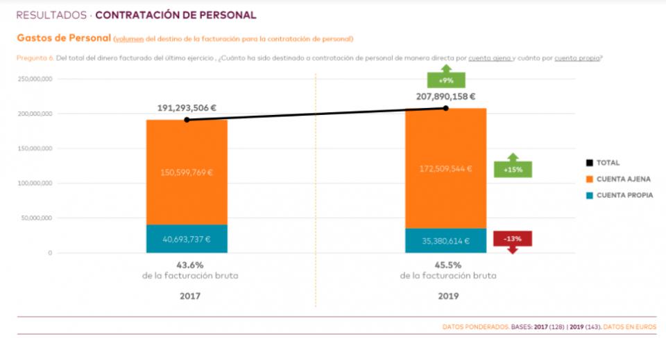 El estudio de la APCP también habla de la generación de empleo en el sector. La cifra calculada total de inversión en personal ascendió a más de 207 millones de euros, lo cual supone un 46% de la facturación en su totalidad y a un 9% más respecto a los años anteriores, según se muestra en la estadística. Dentro de esa inversión de capital, se distingue la contratación de empleados por cuenta ajena (un 83% del gasto), y por cuenta propia (un 17% del total de inversión en personal). Podemos echar un vistazo al siguiente gráfico para ver representados estos datos, en una comparativa respecto al año 2017: