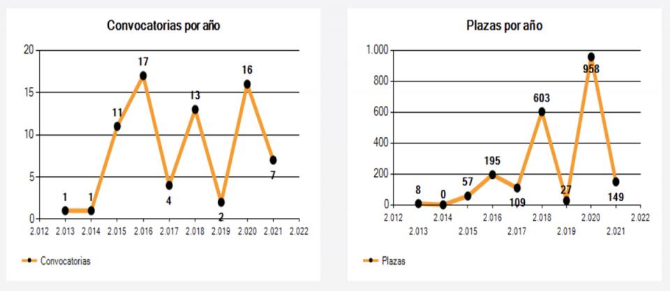 ad laboral notable, tras las sucesivas modificaciones de las condiciones laborales y las sustituciones por diferentes administraciones. Es necesario aún cubrir puestos de profesionales jubilados con empleos estables, ya que cada vez hay más interinos.