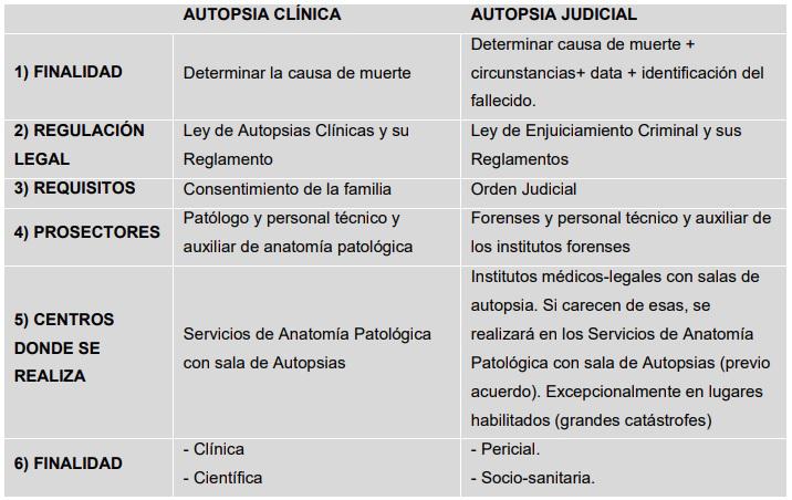 - Autopsia médico-legal o forense, regulada por la Ley de Enjuiciamiento Criminal, destinada a establecer la causa de la muerte en casos de fallecimientos violentos o sospechosos de criminalidad.
