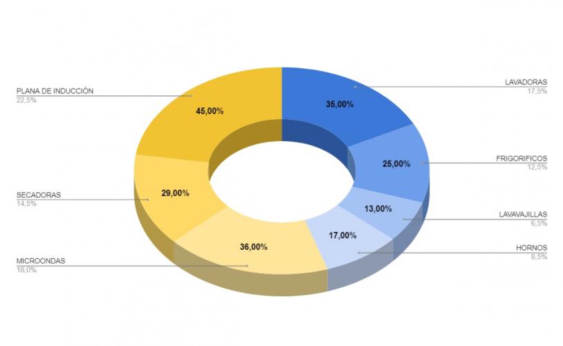 En el ámbito de las reparaciones de electrodomésticos, las planchas de inducción lideran la lista con un 45% de incidencias, seguidas de cerca por las microondas, que representan un 36% de las reparaciones. Las lavadoras, con un 35%, también muestran una alta frecuencia de fallos, reflejando su uso intensivo en los hogares. Las secadoras, utilizadas en climas más fríos o en hogares sin espacio exterior para tender ropa, alcanzan un 29% de las reparaciones. Los frigoríficos, esenciales para la conservación de alimentos, representan un 25%, mientras que los hornos, fundamentales en la cocina, suponen un 17% de las intervenciones. Por último, los lavavajillas, aunque son muy útiles, solo constituyen un 13% de las reparaciones, posiblemente debido a su menor presencia en los hogares comparados con otros electrodomésticos. Esta distribución destaca la importancia del mantenimiento y la calidad en la elección de electrodomésticos para reducir la frecuencia de averías y extender su vida
