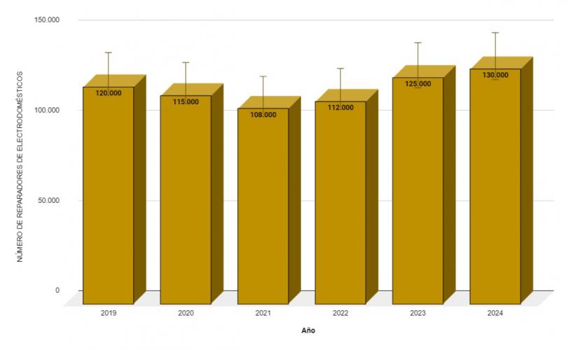 El número de reparadores de electrodomésticos en España ha experimentado fluctuaciones significativas a lo largo de los últimos años. En 2019, se estimaba que había aproximadamente 120.000 reparadores en el país. Esta cifra disminuyó en 2020, situándose en 115.000, probablemente debido a la pandemia de COVID-19 y sus efectos en la economía y en los hábitos de consumo. En 2021, la tendencia continuó a la baja, reduciéndose a unos 108.000 reparadores. No obstante, a partir de 2022 se observó una recuperación, con el número de profesionales aumentando a 112.000. Esta tendencia al alza se consolidó en 2023, con una estimación de 125.000 reparadores. Para 2024, se proyecta un crecimiento adicional, con una estimación de 130.000 reparadores, lo que sugiere una recuperación completa del sector y una mayor demanda de servicios de reparación de electrodomésticos.