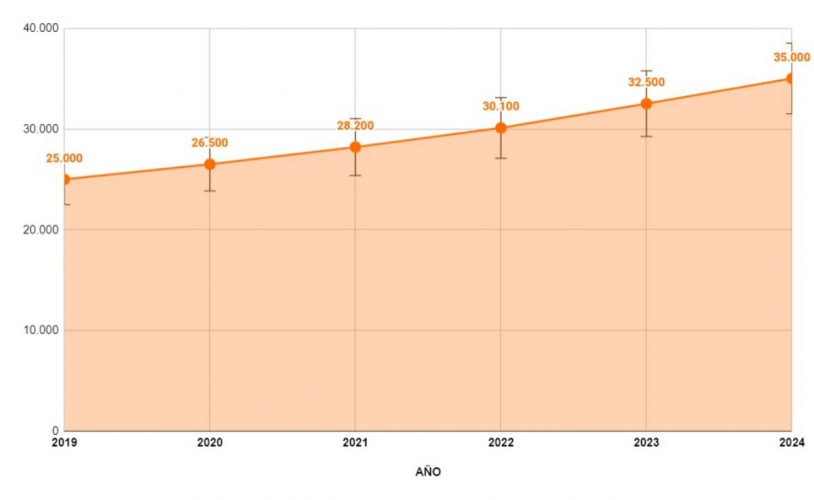 El perfil de Responsable de Calidad y Seguridad Alimentaria ha mostrado un crecimiento constante entre 2019 y 2023, impulsado por la creciente demanda en sectores clave como el agroalimentario, la restauración y, más recientemente, la exportación y la producción ecológica. En 2019, este perfil profesional contaba con 25.000 profesionales en España, y en 2023 ya alcanzaba los 32.500, lo que supone un incremento acumulado significativo. Este crecimiento ha venido acompañado de la diversificación de los sectores que buscan estos especialistas, especialmente a medida que las empresas buscan cumplir con normativas internacionales y adaptarse a nuevas exigencias del mercado. La tasa de crecimiento anual, que en 2019 no presentaba variación significativa, ha alcanzado un 8% en 2023, reflejando una fuerte tendencia hacia la producción sostenible y la exportación de productos bajo estrictos estándares de calidad.
