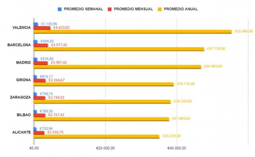 Por el contrario, en otras localidades, los salarios son algo más modestos. Girona ofrece un salario medio anual de 39.176 €, mientras que en ciudades como Zaragoza, Bilbao y Alicante, las remuneraciones se encuentran en la franja más baja, con sueldos promedio que oscilan entre 35.229 € y 38.339 € anuales. Estas diferencias reflejan tanto las características del mercado laboral local como el coste de vida en cada ciudad.