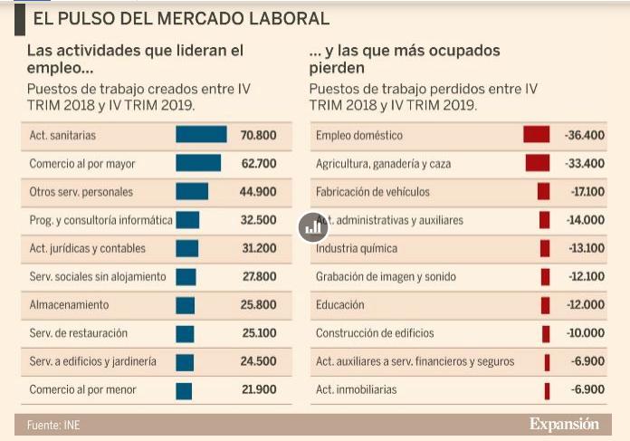 Los datos del INE publicados en Expansión sitúan la contabilidad y las actividades jurídicas en el quinto lugar del ranking de las actividades a la cabeza en la creación de empleo entre finales de 2018 y finales de 2019, o sea, entre las que siguen tirando del carro cuando este indicador, los empleos nuevos en general, no van del todo bien. En 2019 se crearon más de 402.000 empleos, pero fueron más de cien mil menos que el año anterior.
