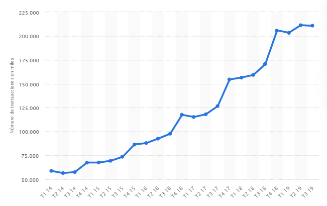 En sl siguiente gráfico, podemos observar la evolución de las transacciones a través de e-commerce en los últimos 6 años, dividida por trimestres. Podemos apreciar la tendencia en alza que finaliza en el segundo trimestre del pasado año, donde se superan los 211 millones de operaciones. En el tercer trimestre, la cifra experimenta una ligera bajada.