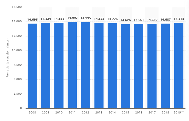 En lo que respecta a los propios hoteles, en 2019 abrieron en España una media de 14.800 establecimientos, la cifra más alta en los úiltimos 6 años. Podemos apreciarlo en el siguiente gráfico: