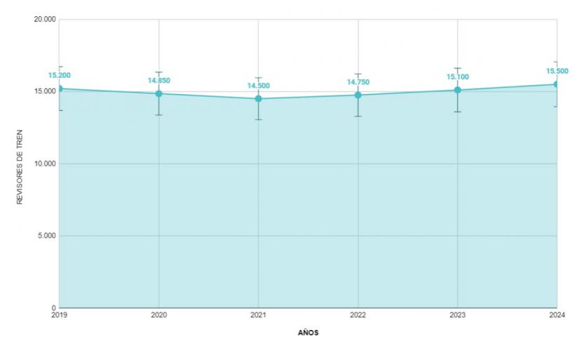 Esta tendencia descendente continuó en 2021, cuando el número total de revisores de tren se redujo aún más, alcanzando los 14.500. La pandemia siguió afectando al sector, con una recuperación lenta y gradual de los servicios ferroviarios y la necesidad correspondiente de personal. No obstante, en 2022 comenzó a observarse una ligera recuperación, con un incremento en el número de revisores que llegó a los 14.750. Este incremento reflejaba una mejoría en la situación sanitaria y una recuperación parcial de la demanda de servicios de transporte.