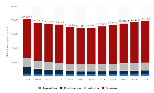 En este gráfico podemos apreciar una evolución del número de ocupados en España entre 2008 y 2019, dividida por sectores económicos. El sector de la construcción está representado en color negro.