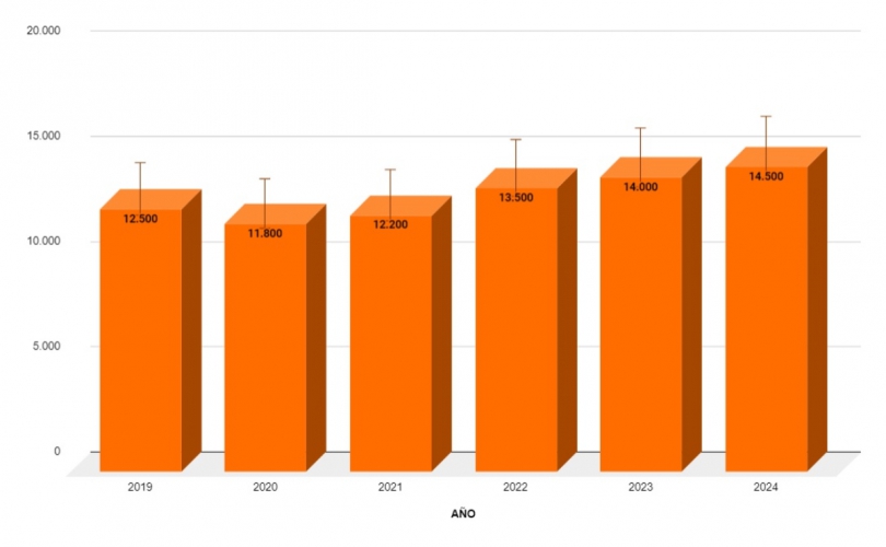En 2023, el mercado laboral mostró una estabilidad relativa, con 14.000 ofertas de empleo, lo que supuso un crecimiento del 3,7% respecto al año 2022. Finalmente, en 2024, el número de ofertas de empleo alcanzó las 14.500, reflejando un crecimiento del 3,6% en comparación con el año anterior.