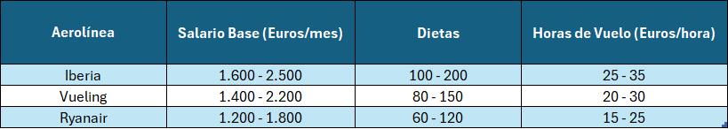 Las dietas varían en función del destino y la duración del viaje. Las horas de vuelo se pagan a un precio por hora establecido por la aerolínea.