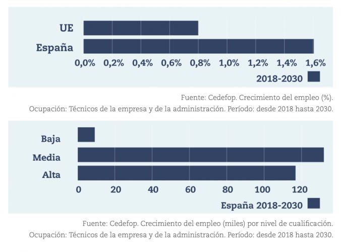 Positivas. Según los últimos informes de la cámara de comercio internacional junto con el banco mundial, la proyección del grupo ocupacional referido a los Técnicos en Administración de Comercio Internacional muestra un incremento de empleo del 1,6%, mayor al de la Unión Europea (en torno al 0,8%). Se prevé una creación de alrededor de 255.000 empleos. Esta creación de empleo beneficiará a personas con nivel de cualificación medio. Además, se estima que en este período se reemplazarán 728.000 trabajadores por jubilación u otros motivos. Los sectores en donde se prevé un mayor crecimiento del empleo (en números absolutos) serán el comercio al por mayor y el comercio al por menor, entre otros.
