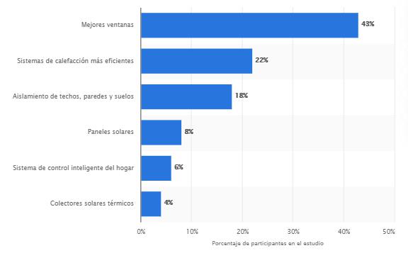 En este gráfico podemos observar que el aislamiento de suelos, paredes y techos es una de las reformas más habituales y requeridas en nuestro país, con un 18% de reformas realizadas en el año 2018. La eficiencia energética es cada vez más importante para los españoles: si nos fijamos en el gráfico, todas las reformas de la lista tienen que ver con ella.