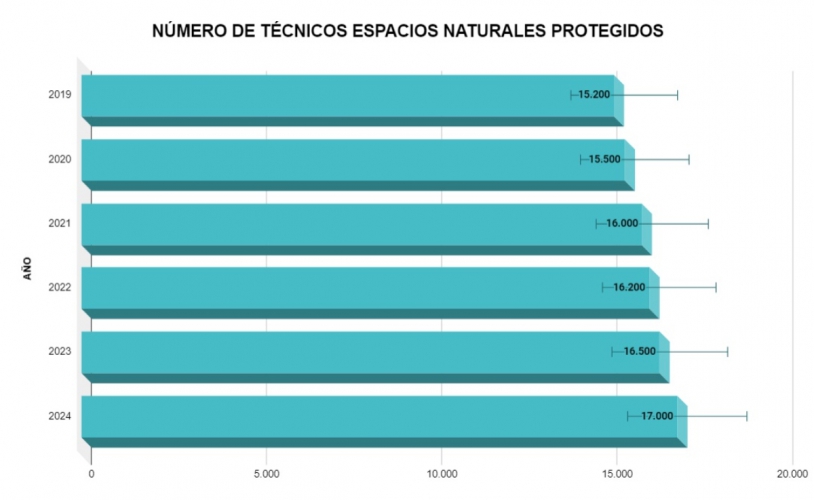 Las proyecciones para 2024 sugieren que esta tendencia de crecimiento continuará, estimándose un aumento del 3% que elevaría el número de Técnicos de Espacios Naturales Protegidos a 17.000. Este crecimiento constante, aunque moderado, indica una demanda sostenida de profesionales en este campo, impulsada por la creciente conciencia y necesidad de preservar y gestionar los espacios naturales protegidos en España. La evolución positiva en los últimos años refleja un sector en expansión, que sigue generando oportunidades laborales y contribuyendo al cuidado del medio ambiente.