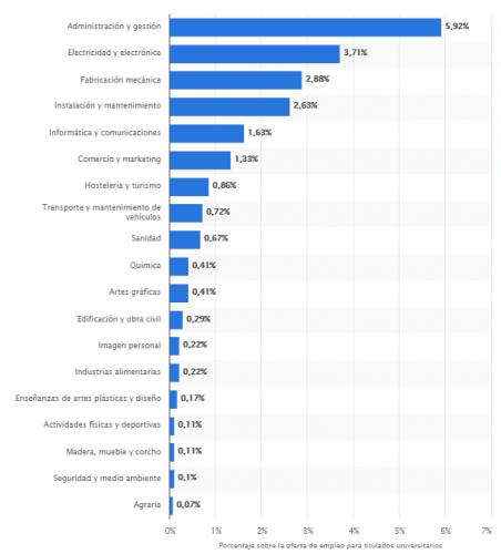Como vemos en este gráfico, la oferta de trabajo para profesionales titulados en Transporte y Mantenimiento de Vehículos constituía un 0,72% del total en España.