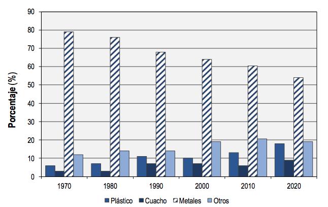 De acuerdo a los datos estadísticos, se puede observar considerablemente que el uso de matriales en tiempos actuales son muy distintos para la fabricación de vahículos. Los cuales pueden ayudar en la estructura y funcionamento de este por el material utilizado.