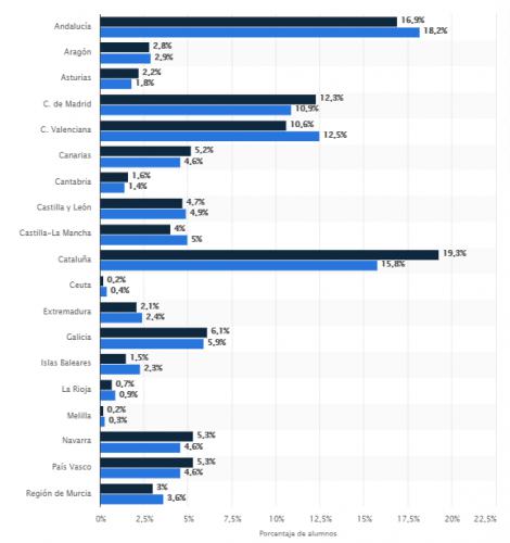En negro, vemos el porcentaje de matriculados en formación profesional de grado superior en las diferentes CC. AA. entre 2018/2019. Por su parte, el azul representa a los matriculados en FP básica y de grado medio.