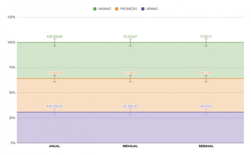 A nivel semanal, los ingresos oscilan entre 625 euros y 729,17 euros, mostrando una compensación estable a lo largo del año. Estos rangos salariales indican que, aunque existe cierta variabilidad en las remuneraciones, el sector ofrece una compensación competitiva acorde con la responsabilidad y especialización del puesto.