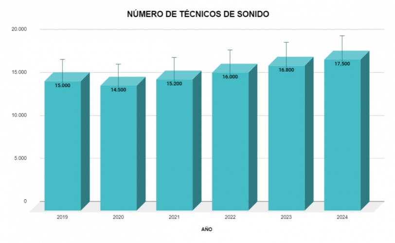 Esta tendencia positiva se mantuvo en los años siguientes, con un crecimiento del 5,26% en 2022, situando la cifra en 16.000, y un incremento del 5% en 2023, alcanzando los 16.800. Para 2024, se prevé que el número de técnicos de sonido aumente hasta los 17.500, lo que refleja un crecimiento anual del 4,17%. Este incremento constante sugiere una revitalización del sector, posiblemente impulsada por una mayor demanda de servicios de sonido en diversas industrias, incluyendo la producción audiovisual, eventos en vivo y nuevas tecnologías, consolidando así el papel fundamental de estos profesionales en el mercado laboral español.