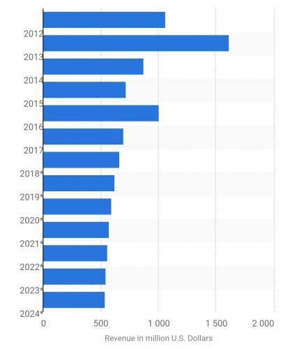 La ingeniería civil se ocupa de la construcción y mantenimiento de infraestructuras como carreteras, túneles, puentes, etc. Coincidirás en que este tipo de construcciones son fundamentales para nuestra sociedad. En el siguiente gráfico podemos apreciar una predicción hasta 2024 de la inversión que se realizará en España en cuanto a la construcción de túneles y puentes, en millones de dólares: