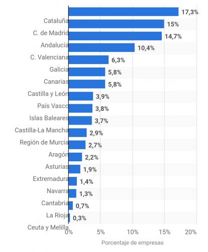 En lo que respecta a empresas, en este gráfico (con datos recogidos en 2018) podemos observar la distribución porcentual de las compañías dedicadas al deporte en España por comunidad autónoma. Ese año, la lista la lideraban Cataluña, Comunidad de Madrid y Andalucía.