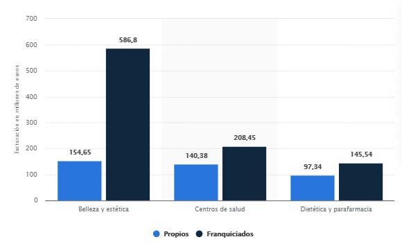 El siguiente gráfico nos muesta una comparativa interesante si tenemos en cuenta ese contexto en el que las personas son cada vez más conscientes de la importancia de su bienestar personal. Podemos apreciar la facturación en millones de euros de establecimientos dedicadas a la salud y a la belleza en nuestro país, por vía de actividad y por locales propios o franquiciados, y entre los que se encuentran los negocios de parafarmacia: