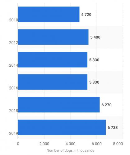 Podemos hacernos una idea del interés creciente de cuidar perros por parte de los españoles en el siguiente gráfico. En miles, observamos el aumento del número de perros entre los hogares de nuestro país en los últimos nueve años: