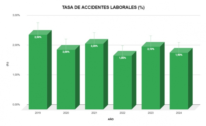 No obstante, después de esta disminución, la tasa de accidentes laborales experimentó una ligera subida, alcanzando el 2,2% en 2021, antes de reducirse a 1,8% en 2022. Esta mejora en la seguridad laboral fue seguida por un ligero aumento en 2023, con una tasa del 2,1%. Finalmente, en 2024, la tasa de accidentes se situó en 1,9%, indicando una tendencia hacia una mayor seguridad en el lugar de trabajo. A pesar de las fluctuaciones anuales, el incremento en el número de trabajadores acompañado de una tasa de accidentes en disminución hacia el final del período sugiere una mejora general en las condiciones laborales y en las prácticas de seguridad.