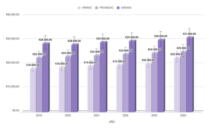 Para 2023, se observó un incremento adicional, con un mínimo de 20.000 euros, un promedio de 24.500 euros y un máximo de 30.000 euros. Se prevé que esta tendencia de crecimiento continúe en 2024, con un mínimo estimado de 22.500 euros, un promedio de 25.000 euros y un máximo de 31.000 euros. Este crecimiento constante refleja una mejora significativa en la retribución de los trabajadores del sector, evidenciando una mayor valorización y reconocimiento de su labor.