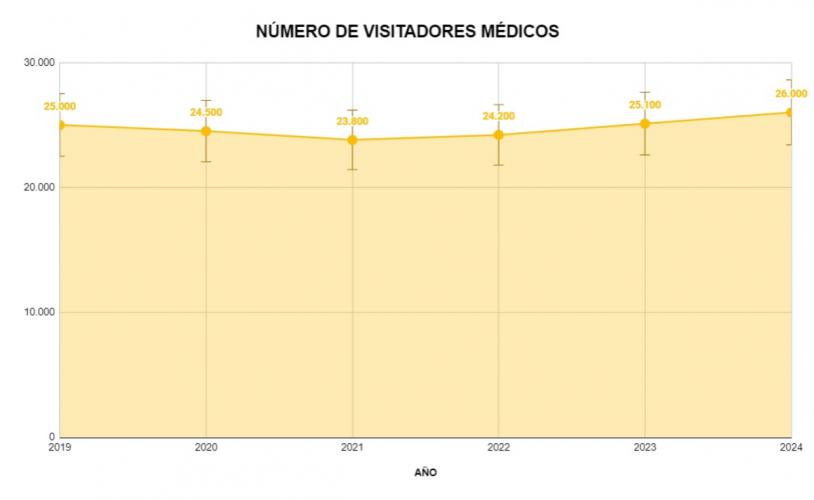 A partir de 2022, el mercado comenzó a mostrar signos de recuperación. El número de visitadores médicos experimentó un repunte, alcanzando los 24,200 profesionales. Este aumento no solo se consolidó en 2023, con una cifra de 25,100, sino que también se espera que continúe en 2024, proyectándose una cifra de aproximadamente 26,000 profesionales.