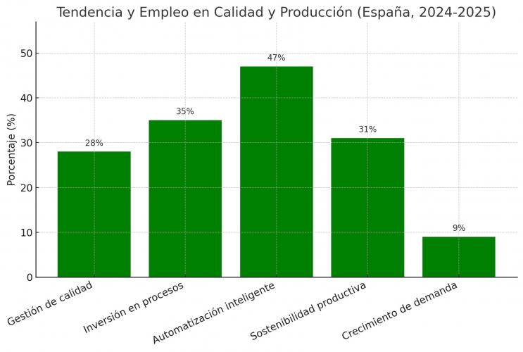 El mercado laboral para los profesionales de Calidad y Producción se encuentra en expansión sostenida. De acuerdo con el Servicio Público de Empleo Estatal (SEPE, Informe de Ocupaciones con Futuro 2025), los perfiles más demandados dentro del ámbito industrial español son los técnicos de control de calidad, ingenieros de procesos, gestores de producción y responsables de mejora continua.