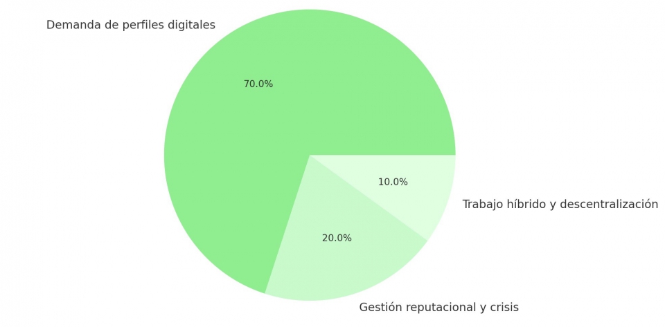 La demanda de perfiles digitales ocupa la mayor parte del gráfico, con un 70%, reflejando el fuerte impulso que vive el sector hacia la comunicación multicanal, la gestión de plataformas online y la necesidad de profesionales capaces de integrar estrategias basadas en datos. En segundo lugar aparece la gestión reputacional y de crisis, que representa un 20% y evidencia el crecimiento de necesidades relacionadas con la transparencia, la protección de marca y la respuesta ante situaciones críticas. Por último, el trabajo híbrido y la descentralización se asigna un 10%, simbolizando la consolidación de nuevos modelos de organización y coordinación dentro de los departamentos de comunicación.