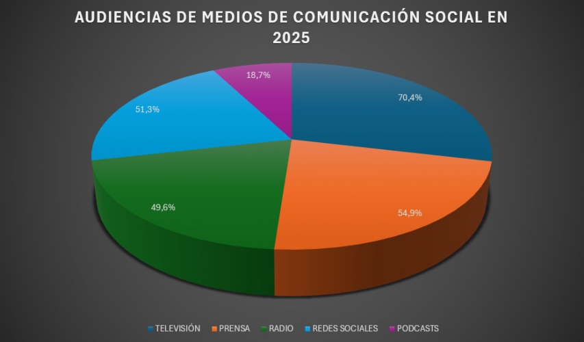 La configuración del sistema mediático español en 2025 está marcada por una fuerte digitalización del consumo informativo y por un paisaje de concentración empresarial que reconfigura tanto la oferta como la percepción pública de los medios. Los datos del estudio sobre audiencias del Centro de Investigaciones Sociológicas (CIS) y análisis sectoriales recientes muestran que la televisión sigue siendo un canal dominante (alrededor del 70 % como referencia de consumo informado), pero las redes sociales han escalado con rapidez hasta convertirse en una fuente clave para amplios segmentos —especialmente jóvenes— (más del 50 % de la población declara informarse por redes en 2025 según el análisis de 2025), mientras que formatos emergentes como los podcasts han crecido notablemente (subida significativa frente a 2023).