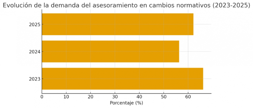 Además, según un dato significativo relativo a los servicios ofertados, el valor añadido del asesoramiento profesional ha experimentado variaciones interesantes: el «asesoramiento en cambios normativos», que lideraba la demanda en 2023 con un 66,2 % de los despachos que lo ofrecían, descendió al 56,3 % en 2024 y en la edición del 2025 se ha recuperado hasta un 62,2 %, ocupando actualmente la cuarta posición entre los servicios más valorados. Esto demuestra que, aunque el asesoramiento normativo sigue siendo relevante, otros servicios han ganado peso, por tanto la adaptabilidad y especialización del profesional en Derecho Empresarial es cada vez más crítica.
