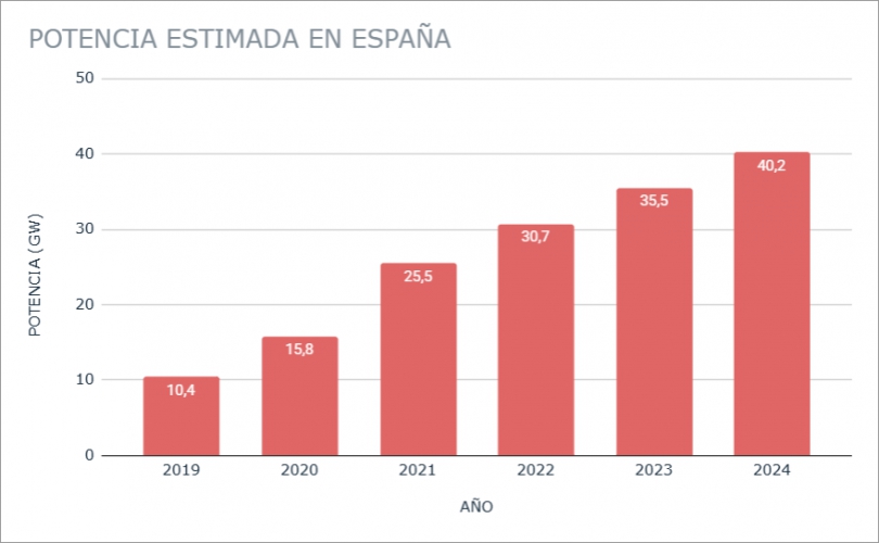 Como prueba del auge de la energía solar podemos observar el aumento de la potencia instalada en España hasta el año anterior: