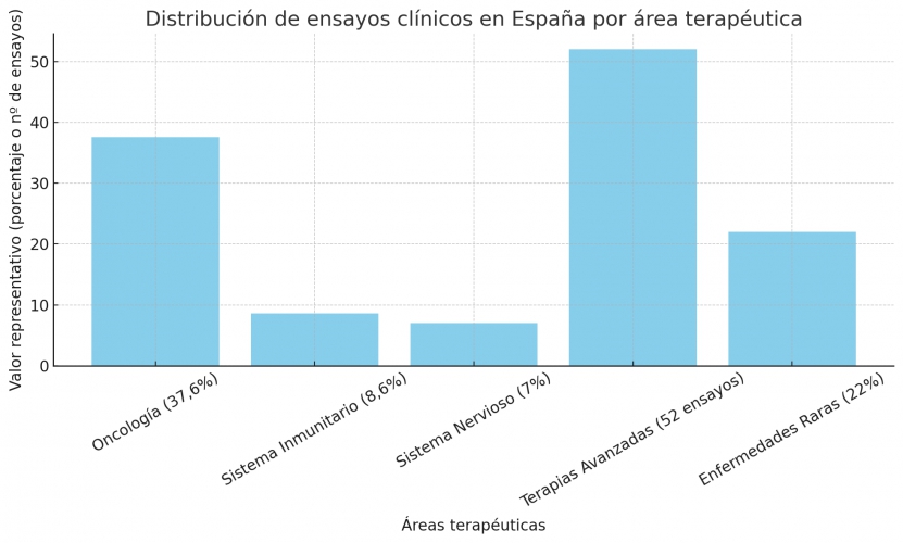 Por otro lado, España también destaca en la investigación de terapias avanzadas, con 52 ensayos clínicos autorizados, consolidando su posición como referente europeo en este campo. Además, un 22% de los estudios realizados está dirigido al abordaje de enfermedades raras, reflejando el compromiso por desarrollar tratamientos para patologías de baja prevalencia pero alto impacto en la calidad de vida de los pacientes.