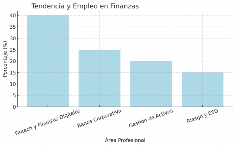 Se observa que Fintech y Finanzas Digitales concentran aproximadamente el 40% de la demanda, reflejando la rápida transformación tecnológica del sector y el aumento de servicios digitales. Le sigue la Banca Corporativa con un 25%, impulsada por la necesidad de especialistas en financiación empresarial y análisis estructurado. La Gestión de Activos representa un 20%, manteniéndose como un área estable gracias al crecimiento de productos de inversión. Por último, el sector de Riesgo y ESG alcanza alrededor del 15%, una cifra que continúa en ascenso debido a la regulación europea y la integración de criterios sostenibles en la toma de decisiones financieras. En conjunto, el gráfico evidencia un mercado laboral dinámico, donde la digitalización y la sostenibilidad marcan las tendencias predominantes.