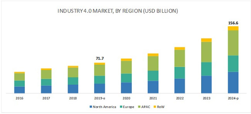 Los numerosos beneficios que aporta la Industria 4.0 han impulsado a muchas empresas a adoptar sus sistemas, logrando así optimizar su productividad, calidad y eficiencia. En los últimos años, la reducción del coste de la tecnología y su mayor accesibilidad han facilitado que cada vez más compañías se unan a esta transformación. El siguiente gráfico muestra el crecimiento de esta tendencia en diferentes regiones y a continuación te presentamos más estadísticas actuales sobre la Industria 4.0: