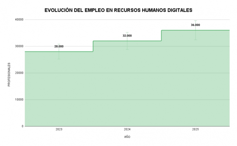 Una evolución claramente ascendente del empleo vinculado al ámbito de los Recursos Humanos Digitales en España entre 2023 y 2025. Se observa un crecimiento progresivo desde aproximadamente 28.000 empleos en 2023 hasta cerca de 36.000 en 2025, lo que refleja una expansión sostenida del sector impulsada por la digitalización de los procesos de gestión del talento.