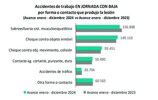 Esto supone una tendencia estable respecto a los 647.495 accidentes laborales registrados en 2023. No obstante, los resultados finales reflejarán un número de casos mayor, podemos observar en el siguiente gráfico la distribución de accidentes pues, estos pueden producirse de diversas formas o contactos, y provocar múltiples lesiones