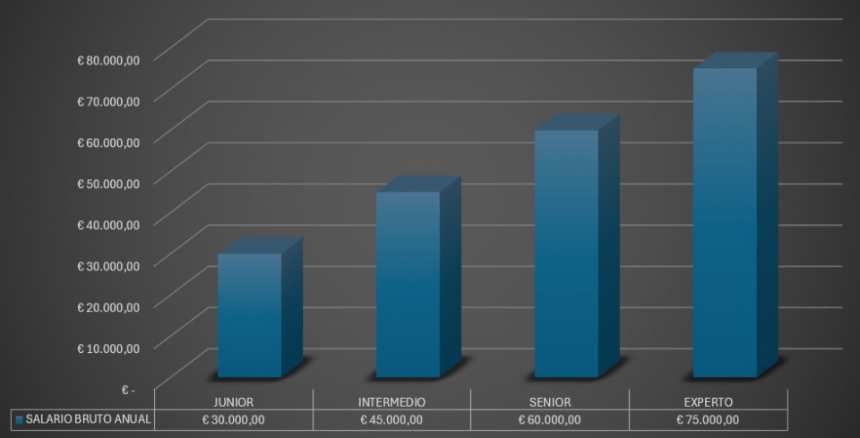 Los perfiles junior (de 0 a 2 años de experiencia) perciben un salario medio anual aproximado de 30.000 €, mientras que los intermedios (3-5 años) ascienden a 45.000 €. Los senior (6-10 años) superan los 60.000 €, y los expertos con más de una década de experiencia pueden alcanzar o superar los 75.000 € anuales.