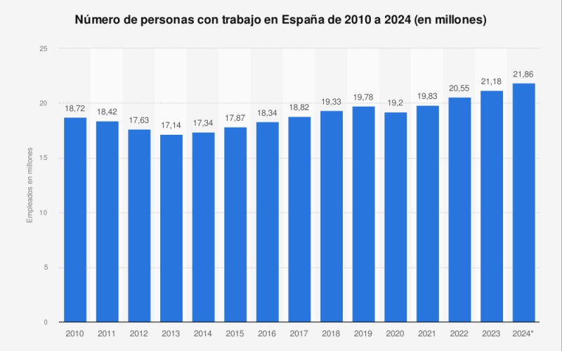 En el siguiente gráfico podemos observar que durante los últimos años, el mercado laboral español ha mostrado una recuperación sostenida, pasando de 17,1 millones de empleados en 2013 a más de 21,8 millones en 2024. Este crecimiento refleja no solo la reactivación económica, sino también la creciente necesidad de profesionales especializados en selección y gestión del talento. Las empresas demandan cada vez más expertos capaces de identificar, atraer y retener personal cualificado en un entorno competitivo. Estudiar Selección de Personal se convierte así en una oportunidad estratégica para acceder a un sector clave en la estructura organizativa moderna y con una proyección laboral en constante expansión.